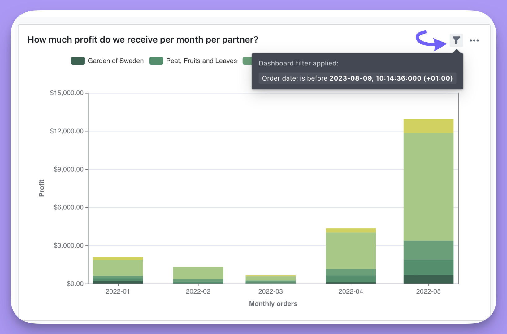 Here’s another example using a date filter: If my original saved chart was filtered to only include orders completed on or after April 3rd, 2024. But, I add a date filter to my dashboard to include orders completed on or after August 1st, 2024, then the dashboard filter would override the saved chart filter and I’ll end up with the chart filtered by orders completed on or after August 1st, 2022.