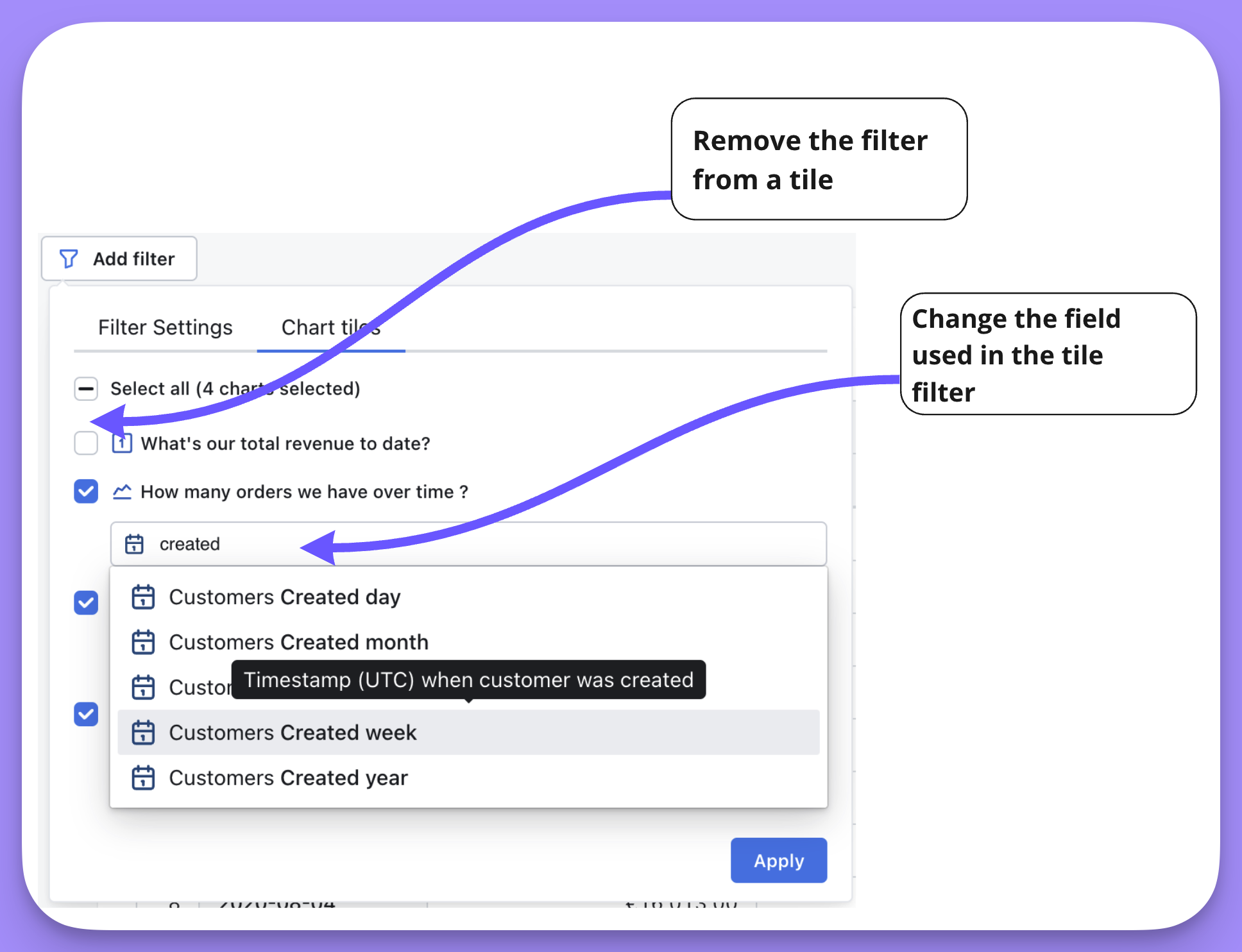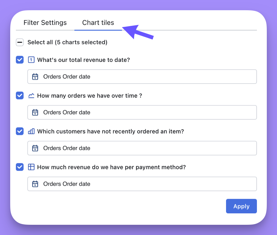 Then, in the Chart tiles tab, you can apply the filter to a SQL chart tile and choose the column you want that filter to apply to. - On a dashboard with only SQL Runner-based tiles, filters are created a little differently since SQL charts are based on columns instead of semantic fields.