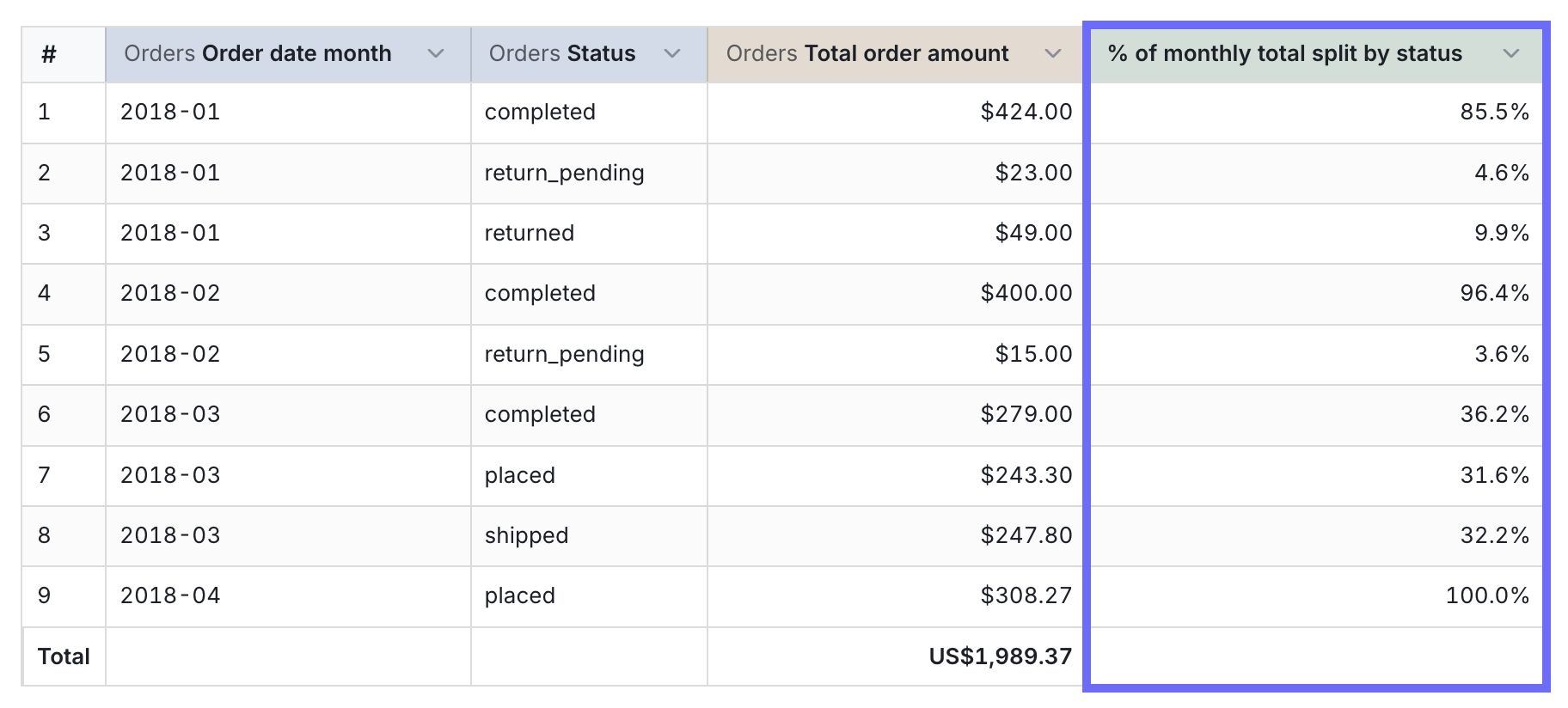 column_i_want_to_see_the_percent_of_total- this is the column that you want to see the percent total of. In our example above, that was thesum of profit.column_i_want_to_group_by- this is the column that you want the total to be grouped by. In our example above, that was theorder date - month.